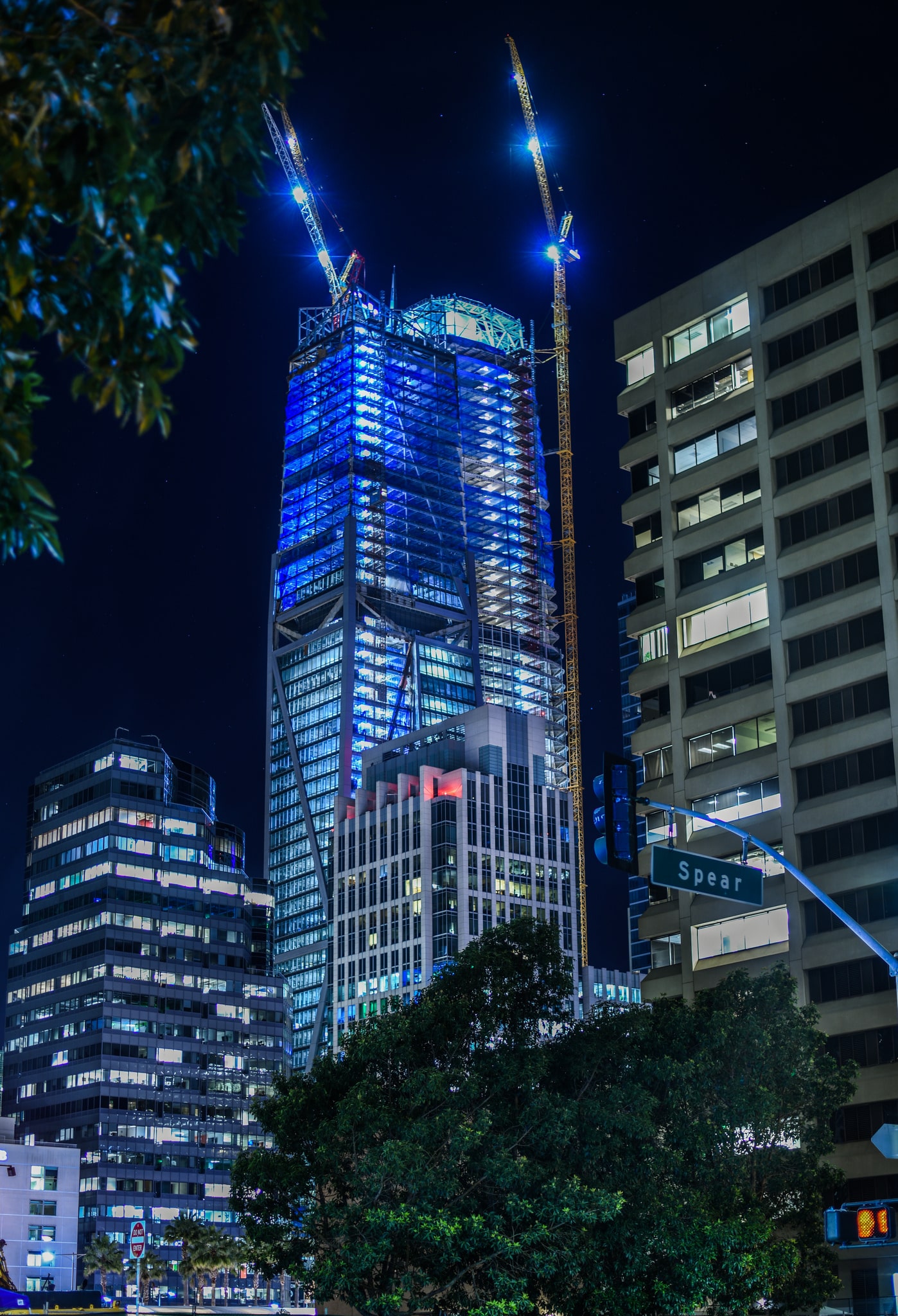 Designed by Heller Manus Architects for the Jay Paul Company, 181 Fremont will eventually rise to a height of 802 feet. The 54-storey, mixed-use, 435,000-square-foot office and 67-unit residential tower will soon become a fixture on the downtown skyline, with signature diagonal bracing that sets it apart from the rest.