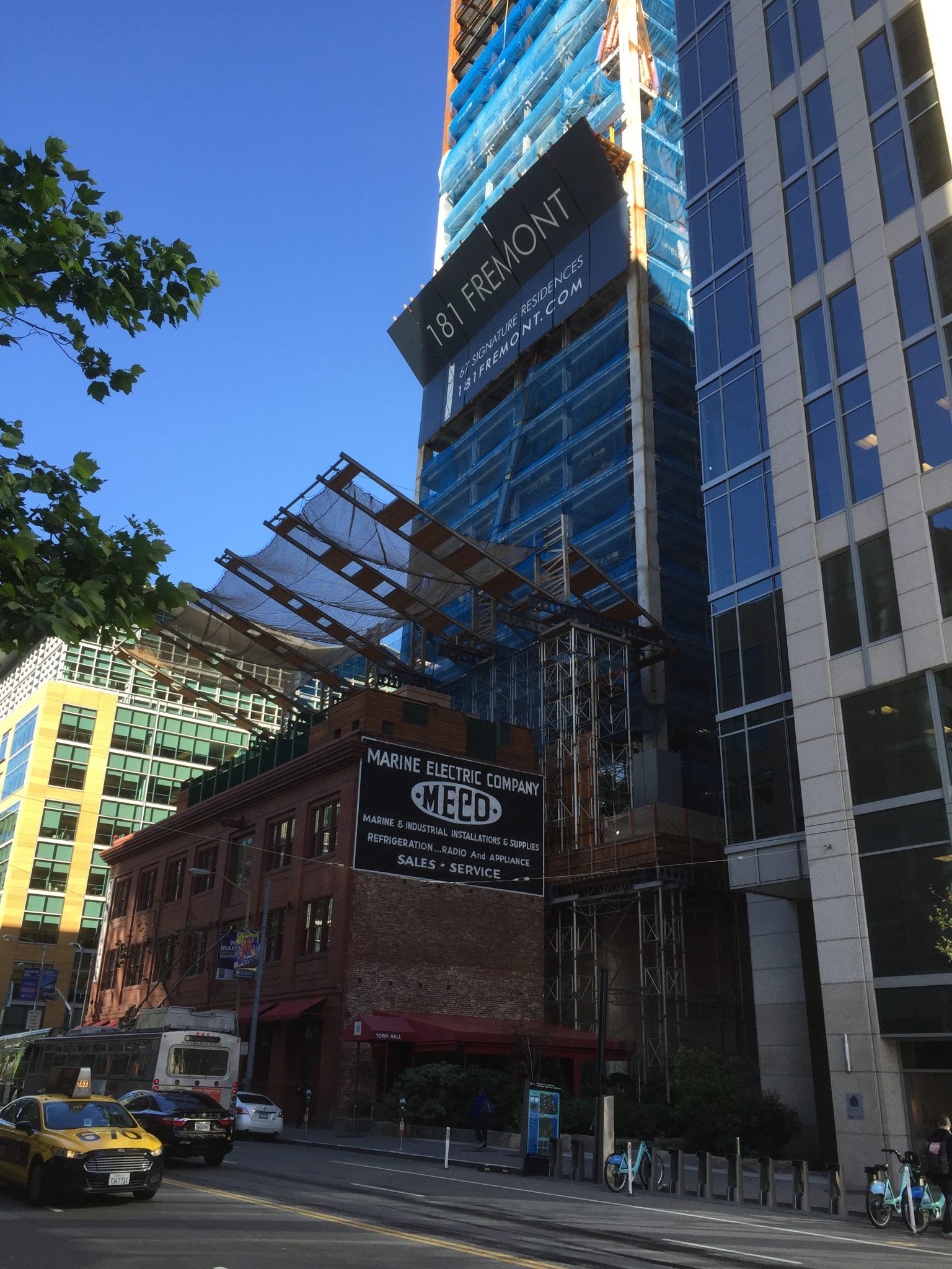 With the construction of the new 181 Freemont tower in San Francisco, a slender 800’ skyscraper nestled between existing buildings, site safety was of paramount concern to the general contractor for the project (Level 10 Construction). Of particular note was the historic four story Meco Building on the south side of the project, which among other tenants housed a day care on the upper story with a playground on the roof. Level 10 chose to provide a custom netting system to provide redundant protection over the entire area of the 60’ wide building below.