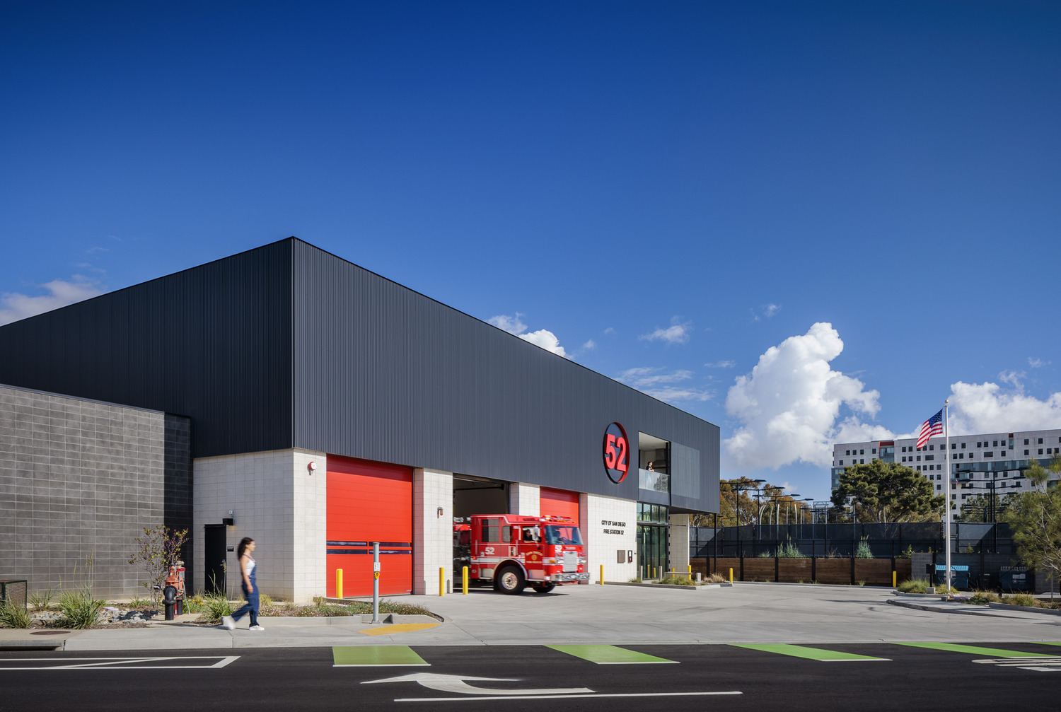 Two-story, 12,300 SF fire station in Torrey Pines. The Torrey Pines Fire Station accommodates three drive-through apparatus bays and nine personnel including a Battalion Chief. The fire station includes a lobby, kitchen and dining, exercise room, locker turnout, ready room, and dorm rooms. The site includes three visitor and 18 firefighter parking stalls along with off-site utility improvements and new emergency signalization mid-block in the public right of way. BIM. LEED Silver.